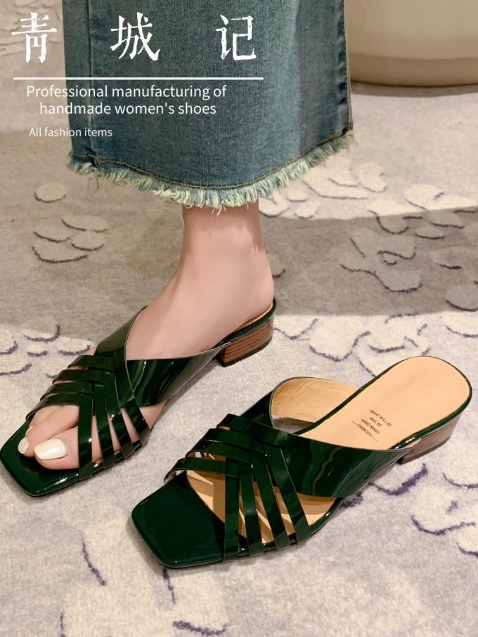 粗跟 尖头 低帮 一脚蹬 浅口鞋 皮革